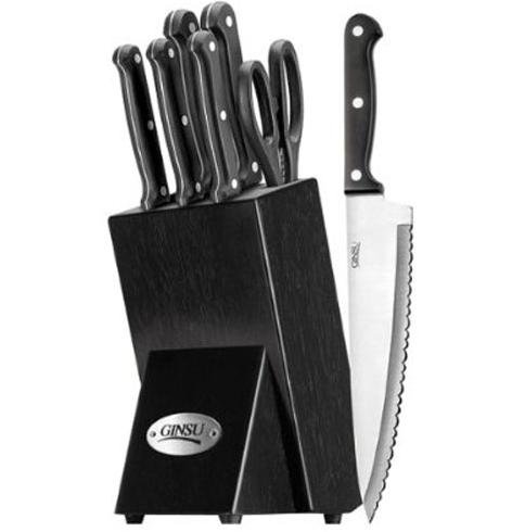 Ginsu Essentials Series 8 Piece Cutlery Set...Ginsu Essentials Series blades are made from commerical quality Japanese Stainless Steel, known for it's strength and durability.Serrated edges ensure a lifetime of use without needing sharpening.Japanese steel tang extends into the handle.Set Includes: 8" Chef Knife, 7" Santoku Knife, 8" Slicer, 5.5" Boning Knife, 5" Utility Knife, 3.5" Paring Knife, Kitchen Shears, Black Storage Block. Read more...