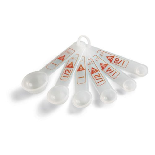 Set of five sturdy plastic measures comes with detachable rings and nests for storage. Includes 1/8 teaspoon (0.62 ml), ¼ teaspoon (1.25 ml), ½ teaspoon (2.5 ml), 1 teaspoon (5 ml), ½ tablespoon (7.5 ml), and 1 tablespoon (15 ml) . Read more...
