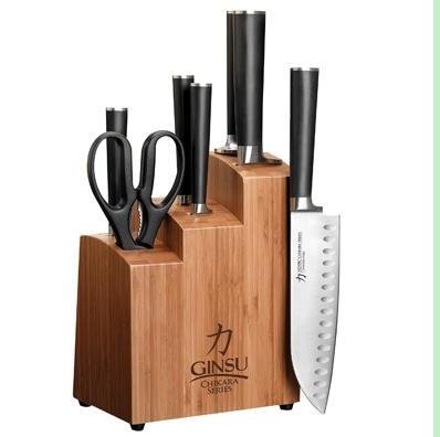 Chikara knives are specialized for their dexterity in chopping, slicing and dicing a wide array of foods; Ginsu Chikara Series Blades are forged from Japanese steel that is known for its stain and rust resistance, strength, and its ability to hold an incredibly sharp edge; Set Includes 3.5" Paring Knife, 5" Utility Knife, 5" Serrated Utility Knife, 7" Santoku Knife, 8" Chef Knife, Kitchen Shears, Sharpening Rod, Bamboo Block. Read more...